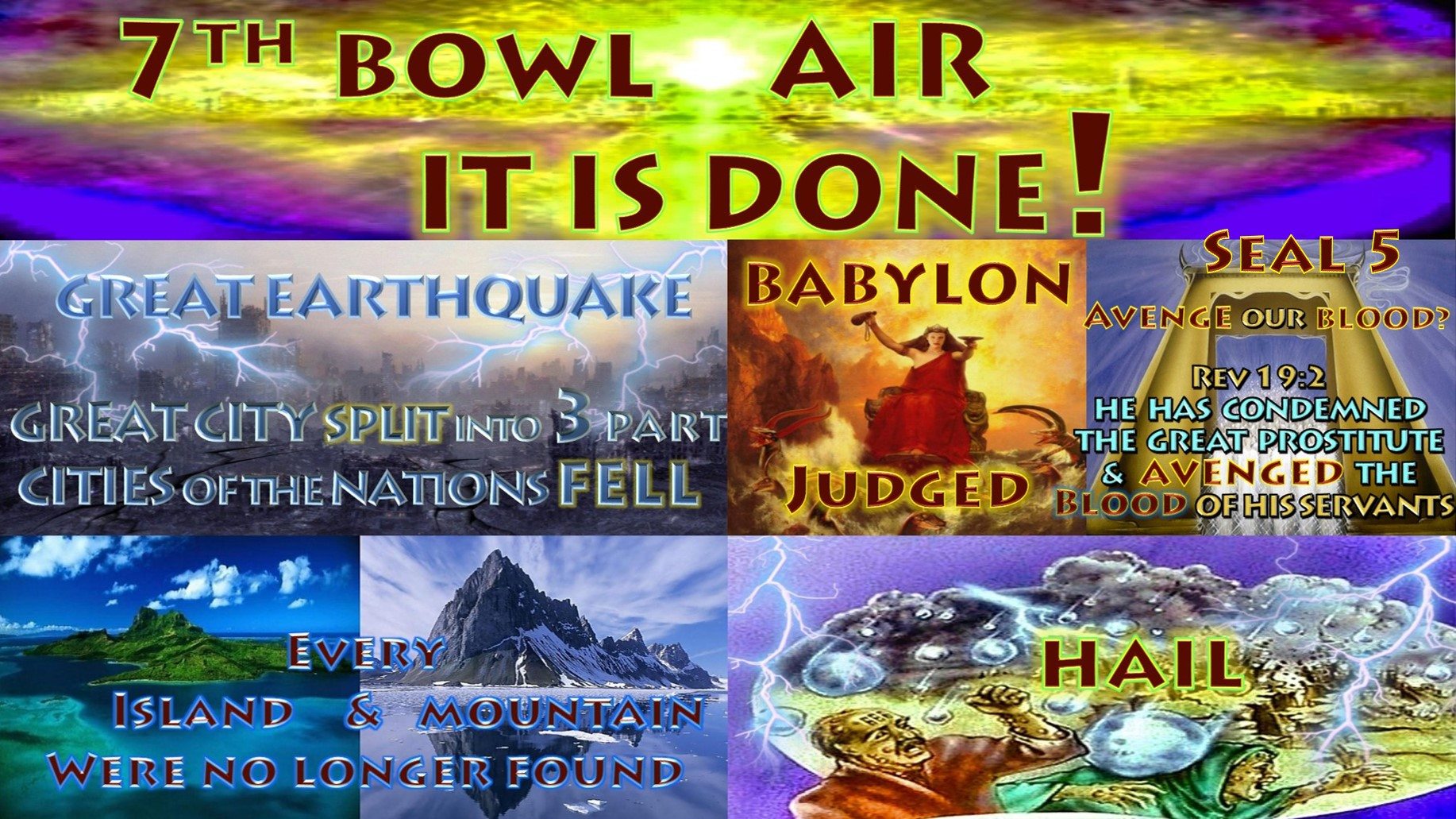 The seventh angel poured out his bowl into the air, and out of the temple came a loud voice from the throne, saying, “It is done!” Then there came flashes of lightning, rumblings, peals of thunder and a severe earthquake. No earthquake like it has ever occurred since mankind has been on earth, so tremendous was the quake. The great city split into three parts, and the cities of the nations collapsed. God remembered Babylon the Great and gave her the cup filled with the wine of the fury of his wrath. Every island fled away and the mountains could not be found. From the sky huge hailstones, each weighing about a hundred pounds, fell on people. And they cursed God on account of the plague of hail, because the plague was so terrible.