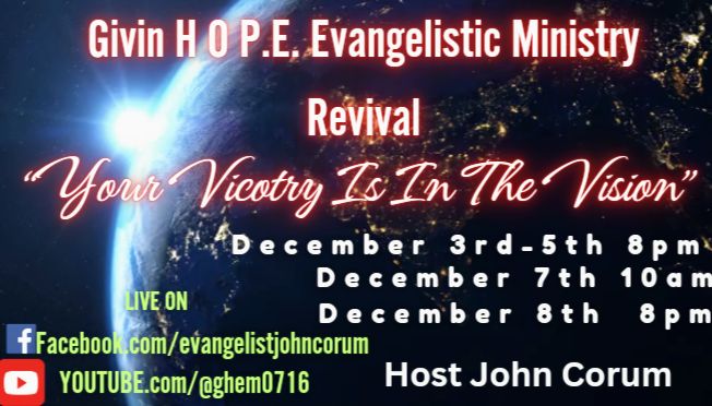 Be ready for GivinH.O.P.E. Evangelistic Ministry revival over Facebook and YouTube Thursday and Friday. 8 pm est