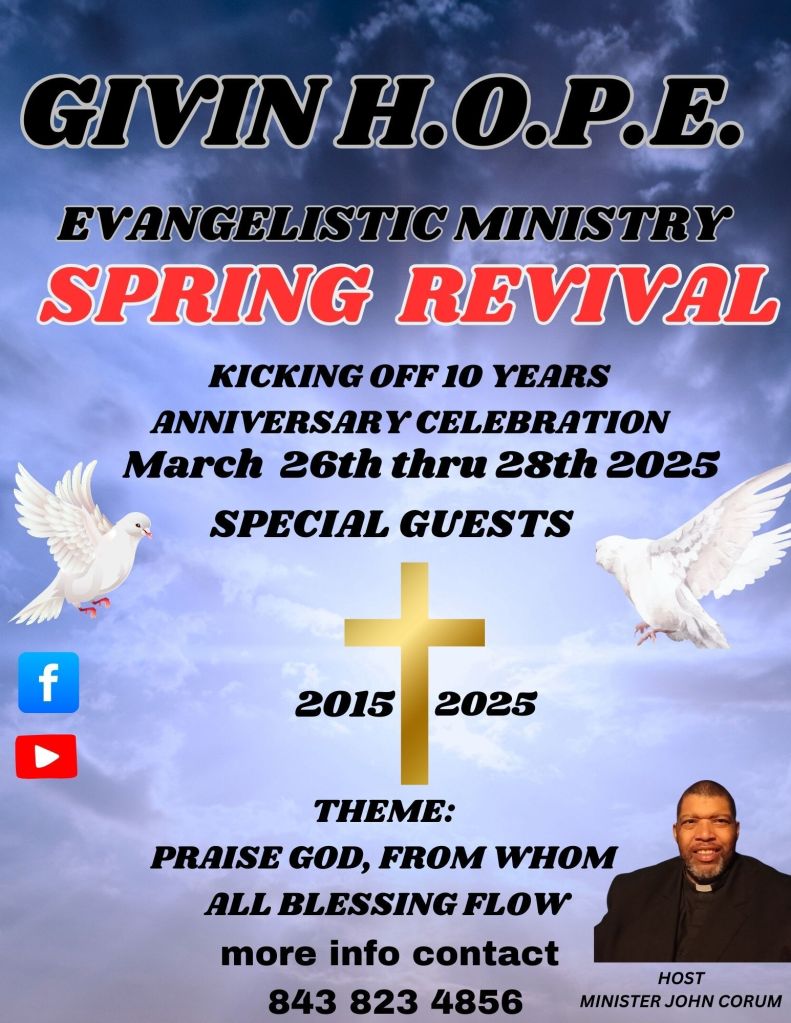 Join Givinhope Evangelistic Ministry on March 26-28 at 10 am and 7 pm Est for a grand celebration of H.O.P.E. across this world.