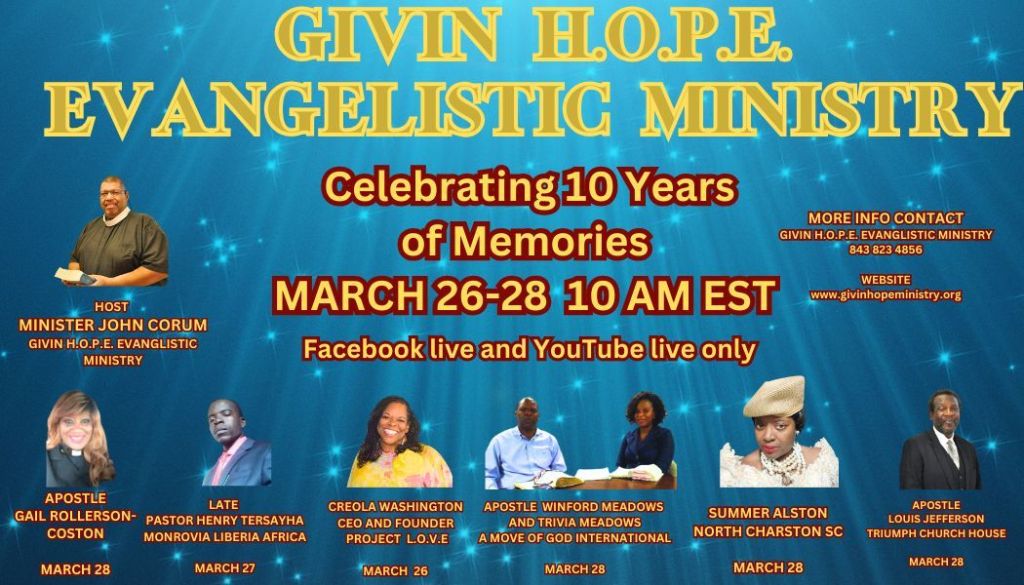 We will be doing a morning presentation from March 26 thru March 28. This presentation will be of clips from the ministries Givinhope Evangelistic Ministry has been a part of. From Sunday School to setting up recordings to air on the local television station in North Charleston Sc.
