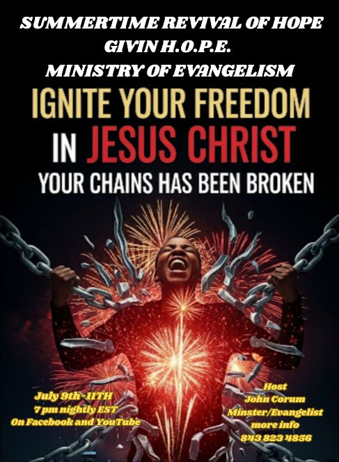 We will be talking about freedom, during our revival on July 9-11. Join us on Facebook or YouTube information will be coming soon on the channel location.