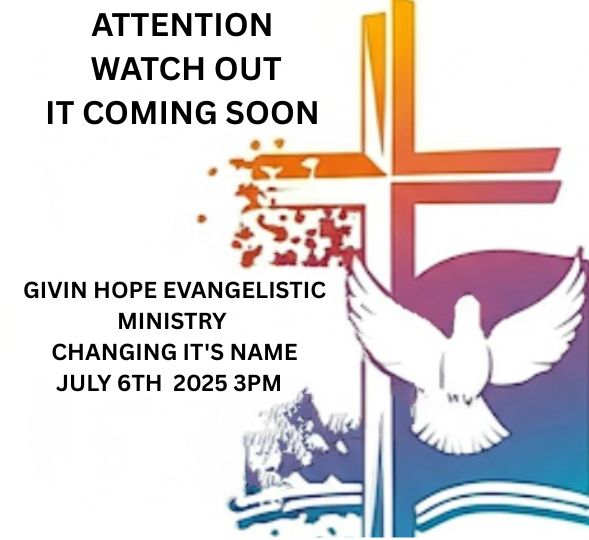 Today we are announcing the ending of the name Givinhope Evangelistic Miniistry. We are moving into a new name tomorrow. It will be launching on July 6th 3 pm. Both streaming broadcasts can be viewed over Facebook or YouTube. Link will be posted before the live video starts.